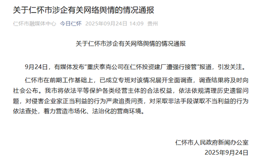 9月25日,遵义市人民政府新闻办公室发布“关于对仁怀市涉企有关问题提级调查的情况通报”: