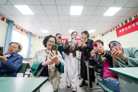 青羊区锦屏社区活动室里,一片“银发身影”格外亮眼。放弃了麻将桌与龙门阵的老人们,正全神贯注地跟着老师学习手机短视频制作,劲头丝毫不输年轻人。“蒙版咋设置?”“这个配乐好不好听?”课堂上,老人们追着老师问、拉着同桌聊,认真的模样仿佛回到学生时代。